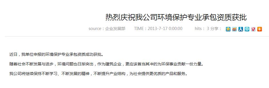 近日,我單位申報的環境保護專業承包資質成功獲批。 隨著社會不斷發展與進步,環境問題也日漸突出,作為建筑企業,更應該首當其沖的為環保事業貢獻一份力量。...