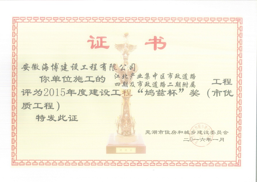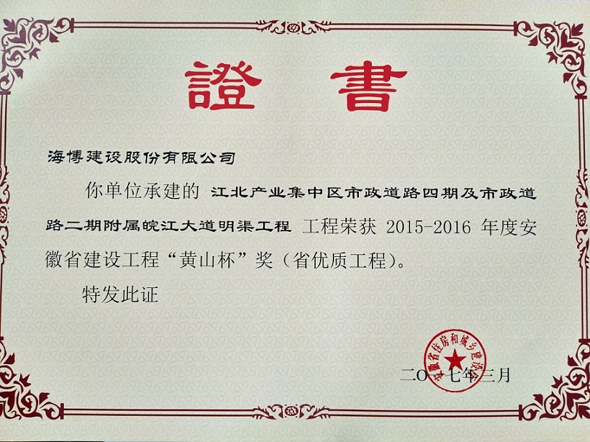 近期,我公司承建的江北產業集中區市政道路四期及市政道路二期附屬皖江大道明渠工程,喜獲2015-2016年度安徽省建設工程“黃山杯”榮譽。該工程位于蕪湖市鳩江區江北產業集中區起步區內,路線全長約9.4km,呈“井”字形布局,路面寬度24~32m,設計車速40km/h,新建瀝青混凝土路面,工程總造價約1.47億元。2014年3月,榮獲江北產業集中區“安全生產工作先進單位”稱號。2016年1月,獲得2015年度蕪湖市建設工程“鳩茲杯”獎,全面實現了工程質量目標。